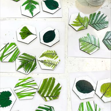 To highlight the fine details and veins, we rub oil pastels into the wax impressions, then gently remove the excess with olive oil—revealing the beautiful textures left by the natural materials.